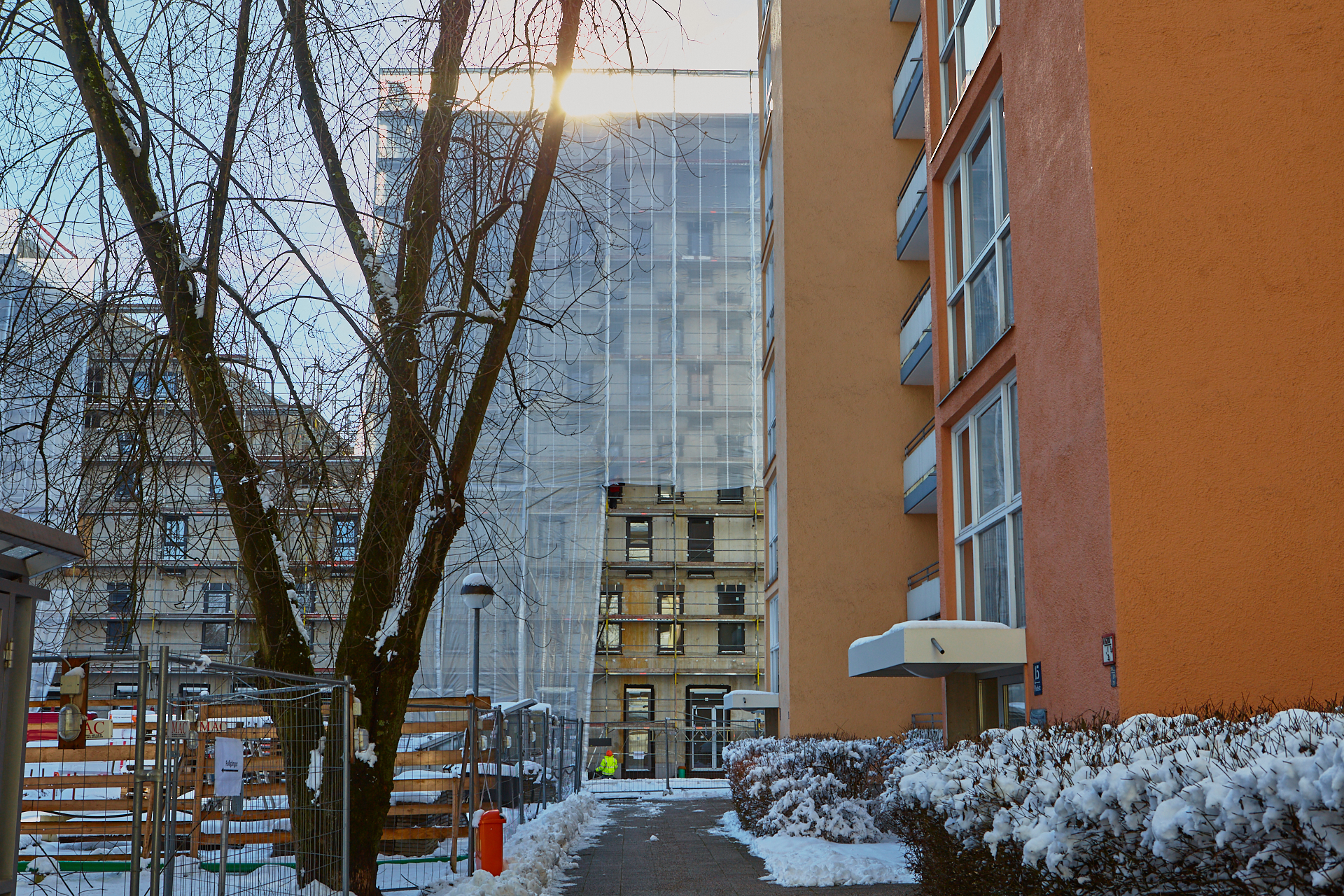 Die Baustelle am LAO-Haus ist immer noch mit Planen verhüllt. Hinter der Plan und im Inneren gehen die Arbeiten zugig voran. Die Bauarbeiten gehen auf volle Touren weiter