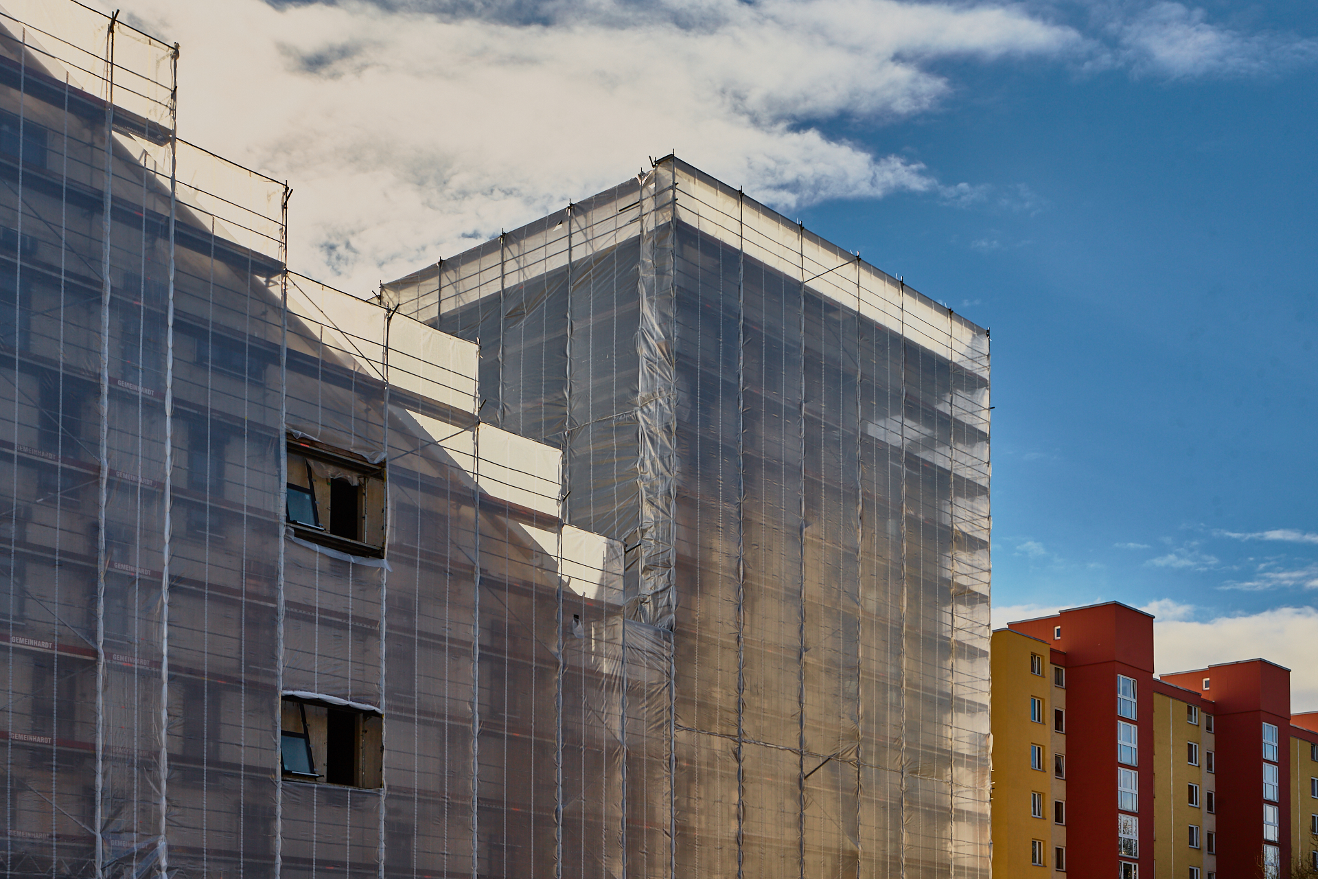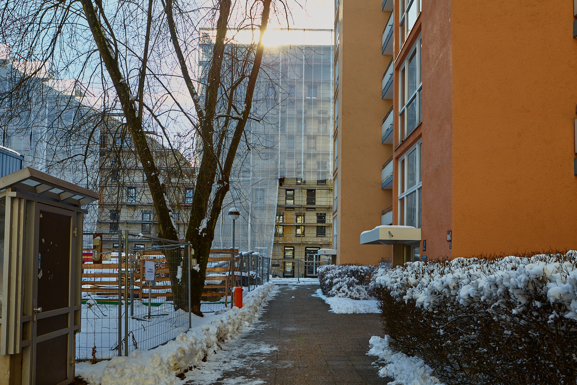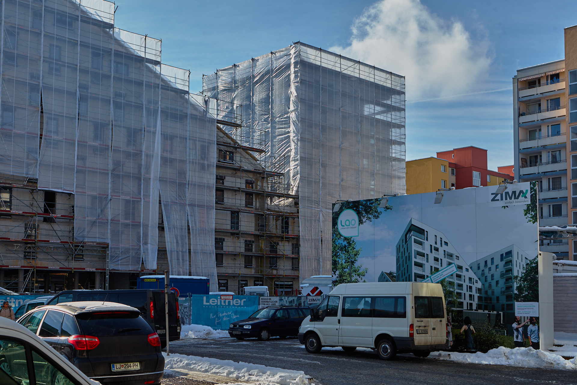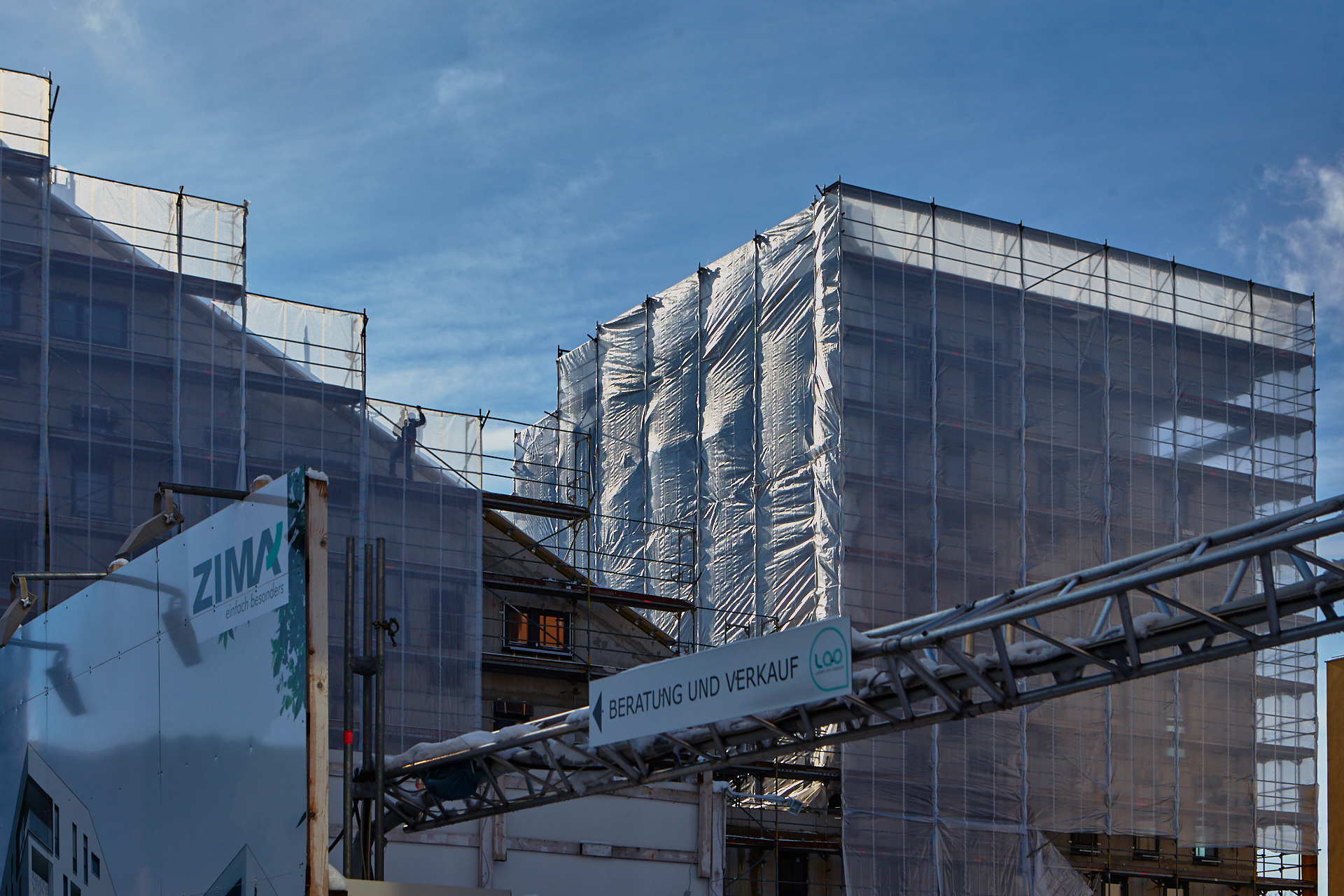 Die Baustelle am LAO-Haus ist immer noch mit Planen verhüllt. Hinter der Plan und im Inneren gehen die Arbeiten zugig voran. Die Bauarbeiten gehen auf volle Touren weiter