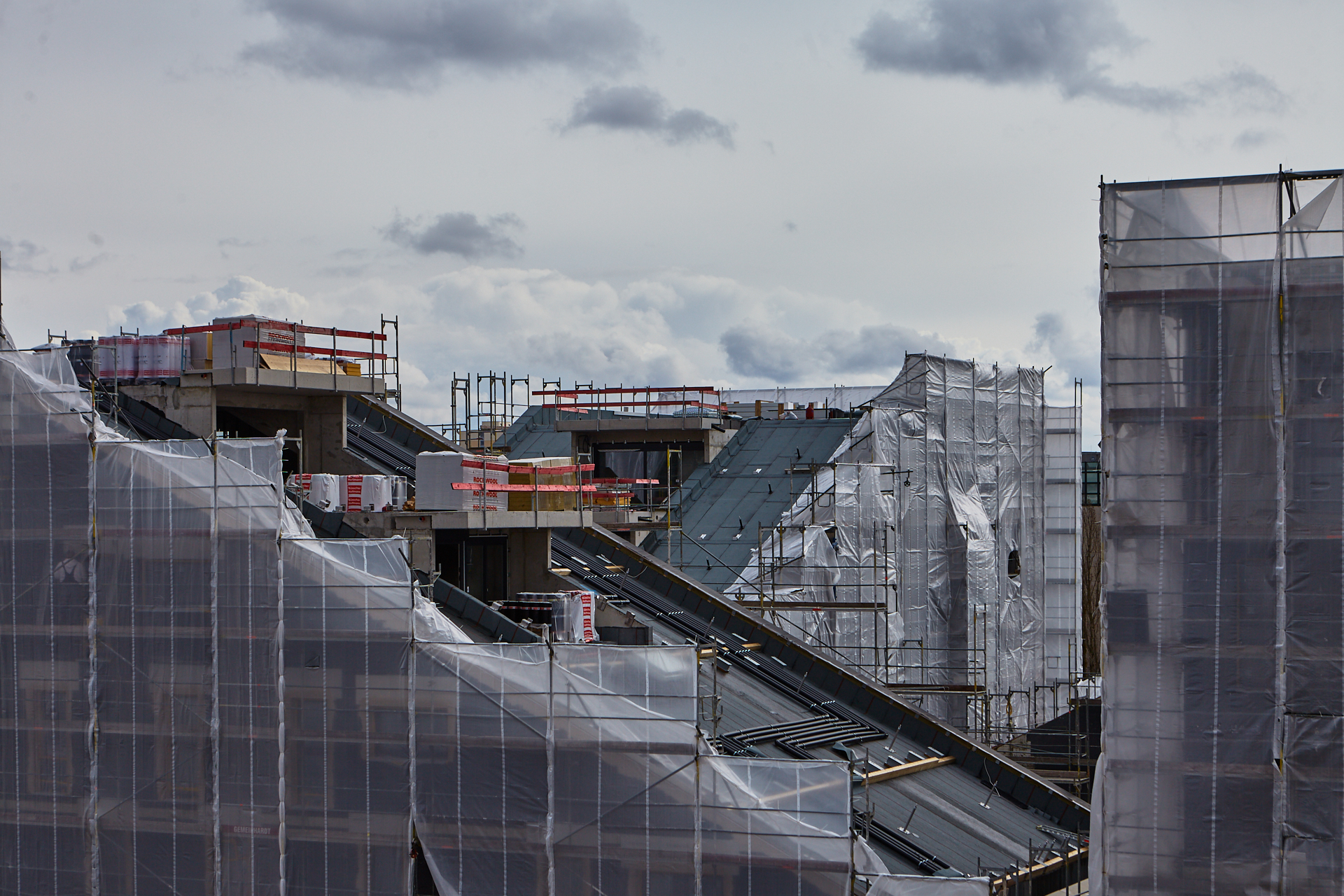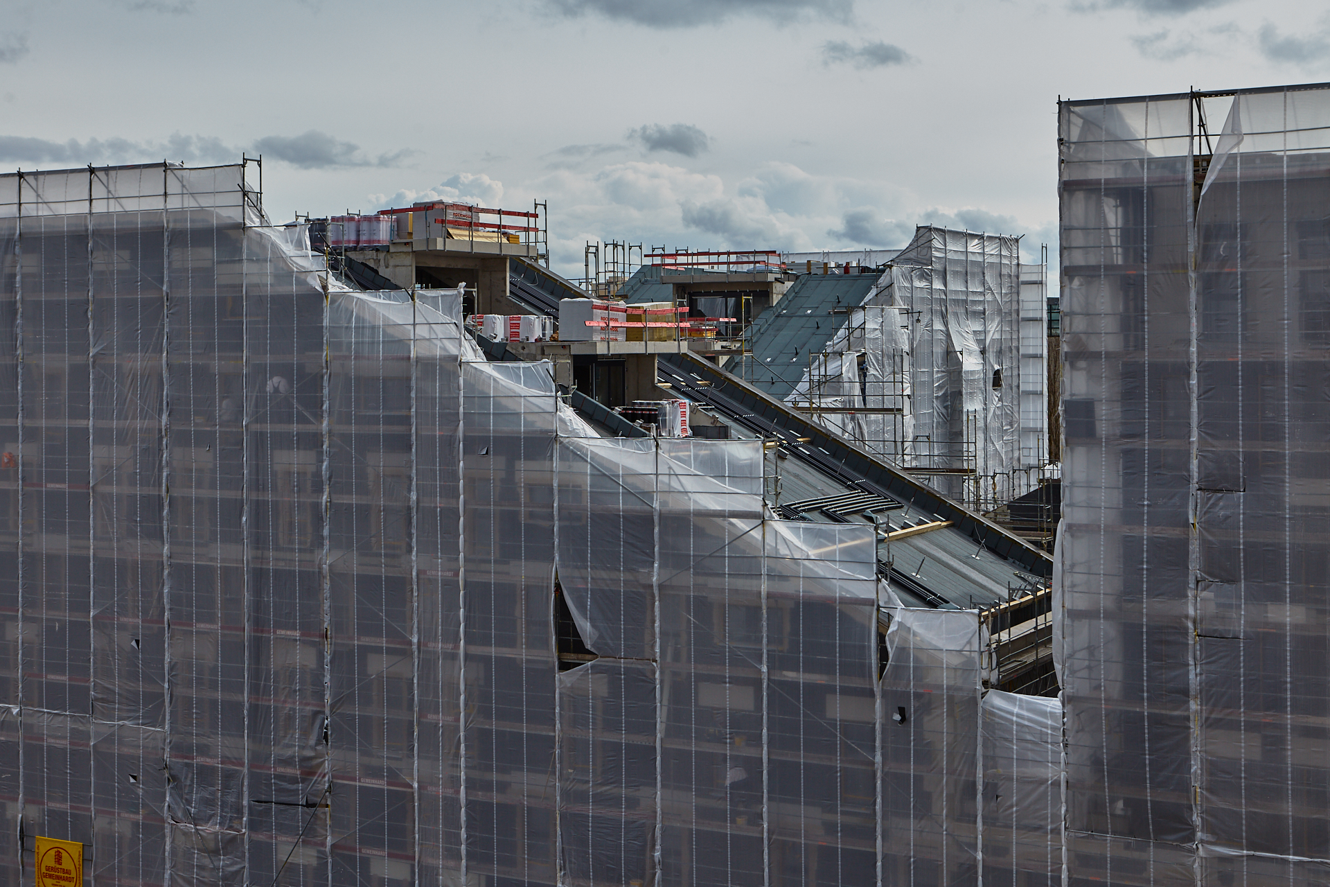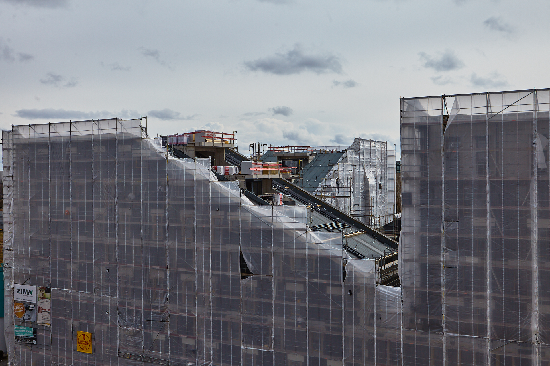 Die Baustelle am LAO-Haus ist immer noch mit Planen verhüllt. Hinter der Plan und im Inneren gehen die Arbeiten zugig voran. Vom Nachbarhaus aus, sieht man deutlich, wie die vier "Türme" des LAO-Hauses zuenenander stehen.,