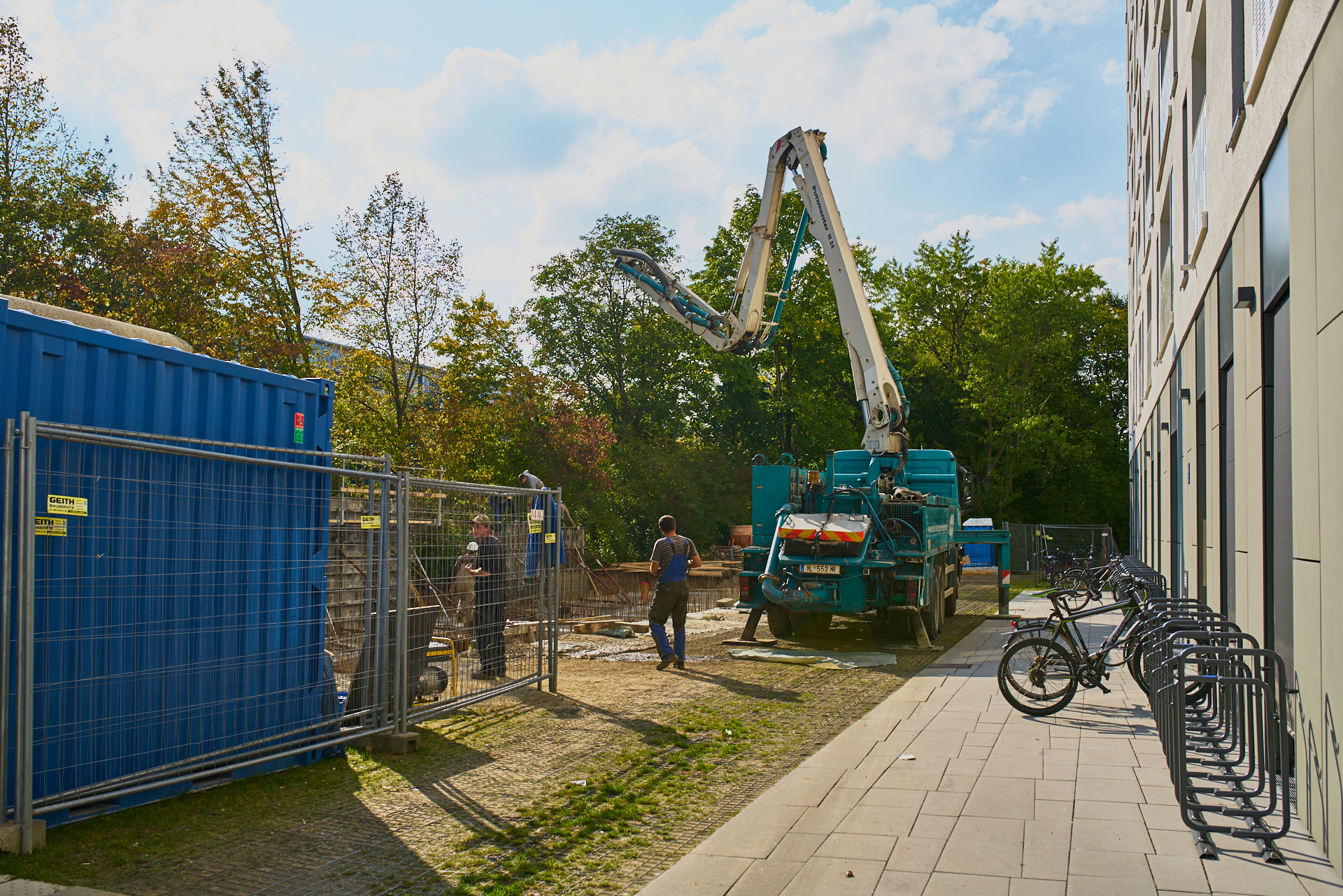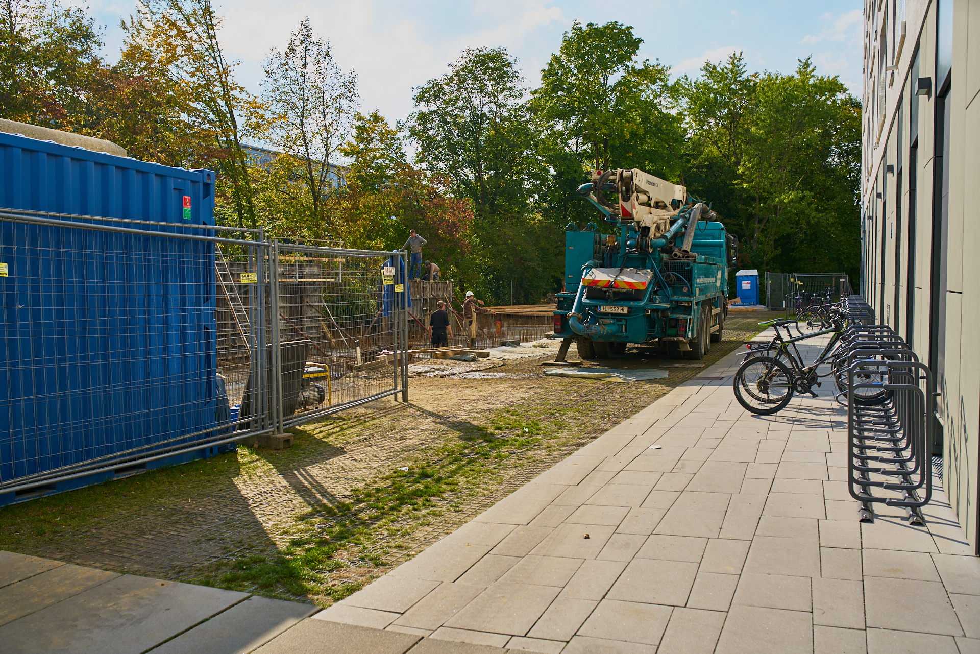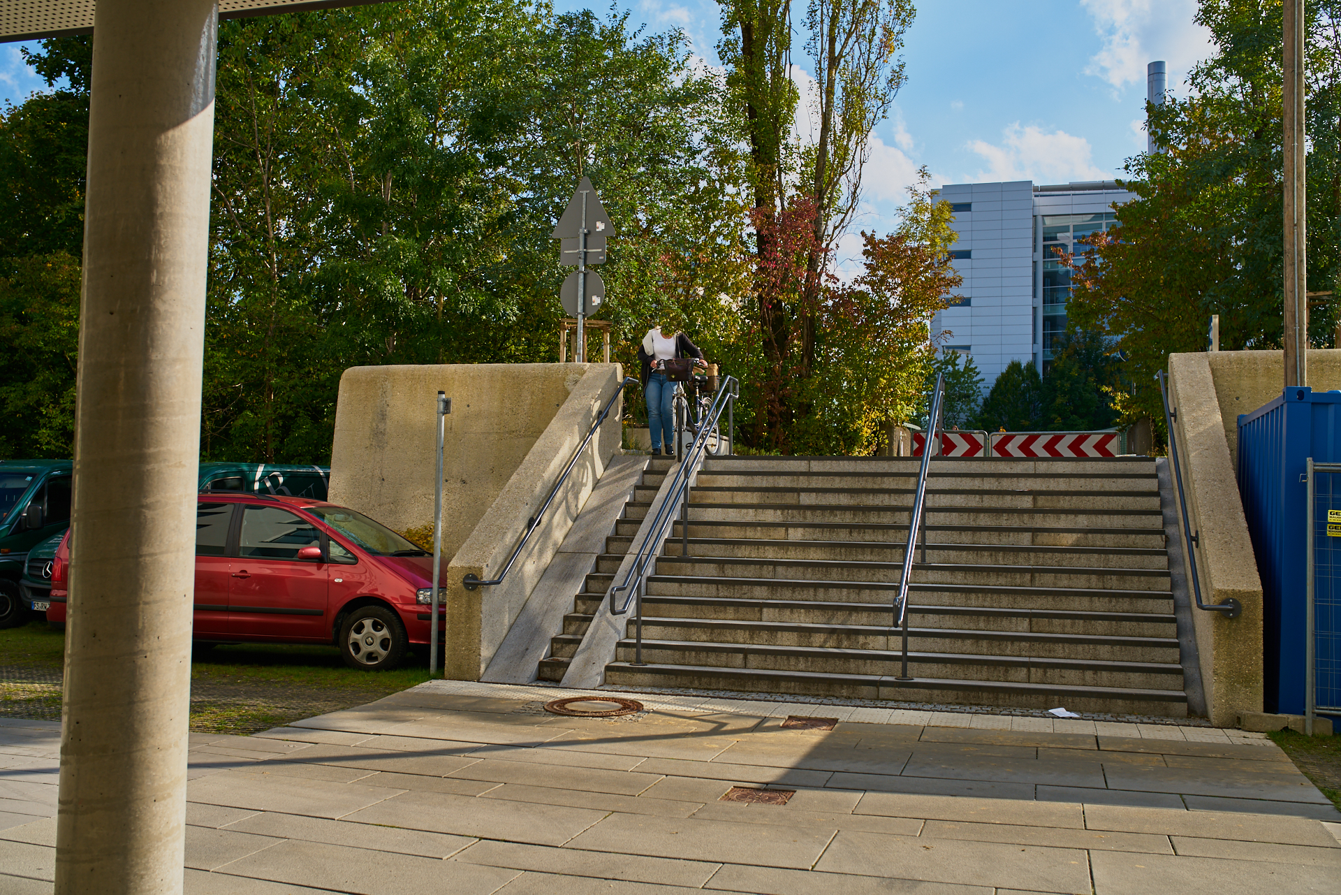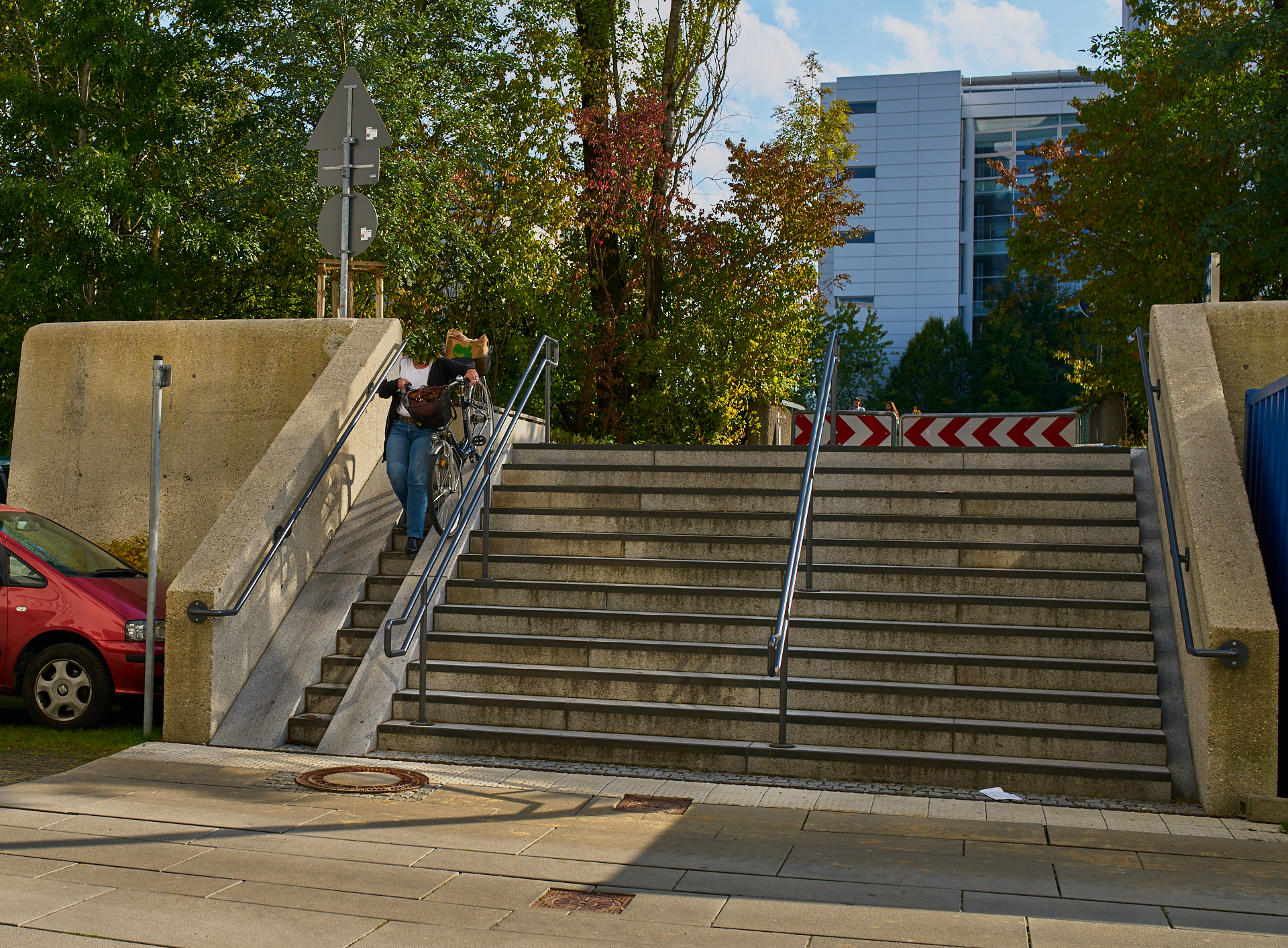Heute am 26.09.2017 wurde mit einer Betonpumpe zwischen den Spundwänden, welche die Begrenzung der Rampe bilden, Beton gepumpt. Morgen kann die Verschalung entfernt werden. Dann stehen die ersten Wände. Das Ende der verpfuschten Treppe ist absehbar. Gerade als ich heute diese Aufnahmen machte, ist eine Frau mit Fahrrad von der Brücke gekommen und wollte das Fahrrad die Treppe hinter schieben. Es ist ihr aus der Hand gerutscht und krachend nach unten gefallen. Es ist zum Glück nichts passiert. Der Plan der Treppe ist zu sehen unter: http://marx-zentrum.com marx-zentrum
