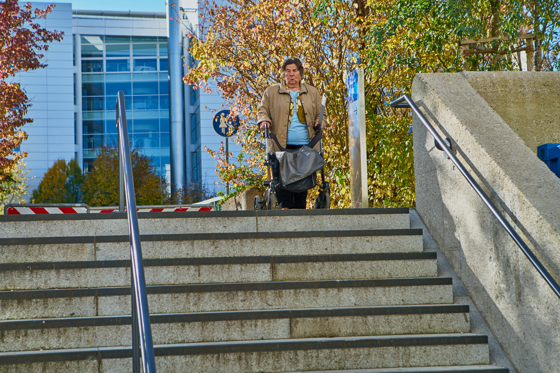 Sie stand Hilfesuchend oben auf der Treppe und konnte mit ihren Einkaufstüten und dem Rollator, nicht heruntergehen.