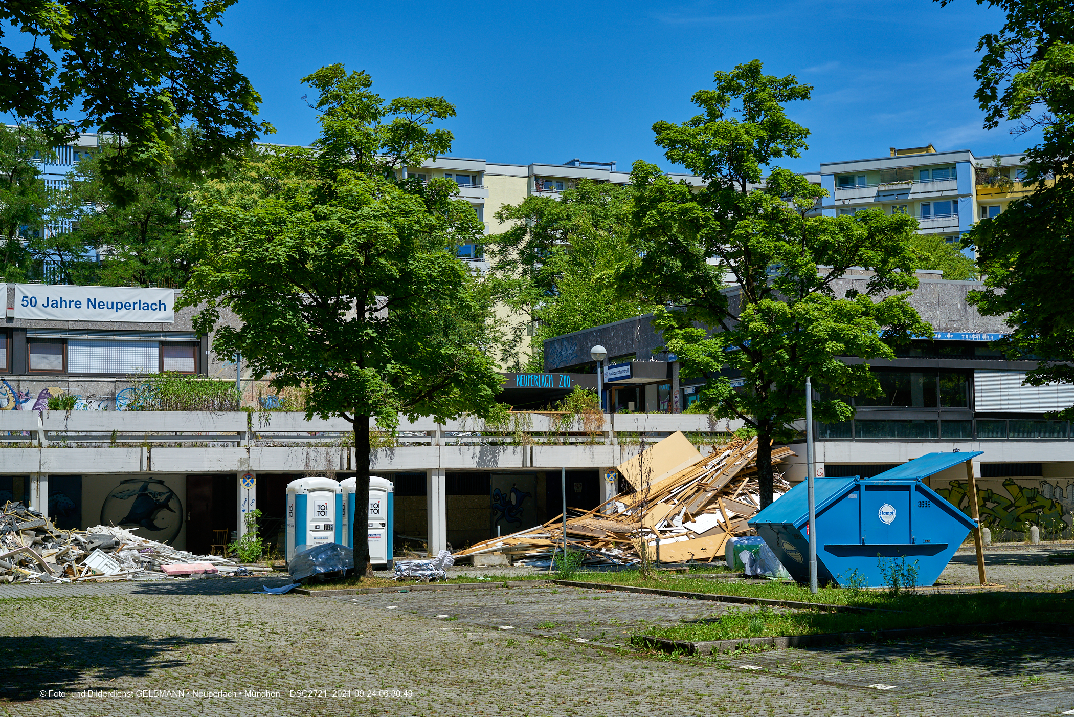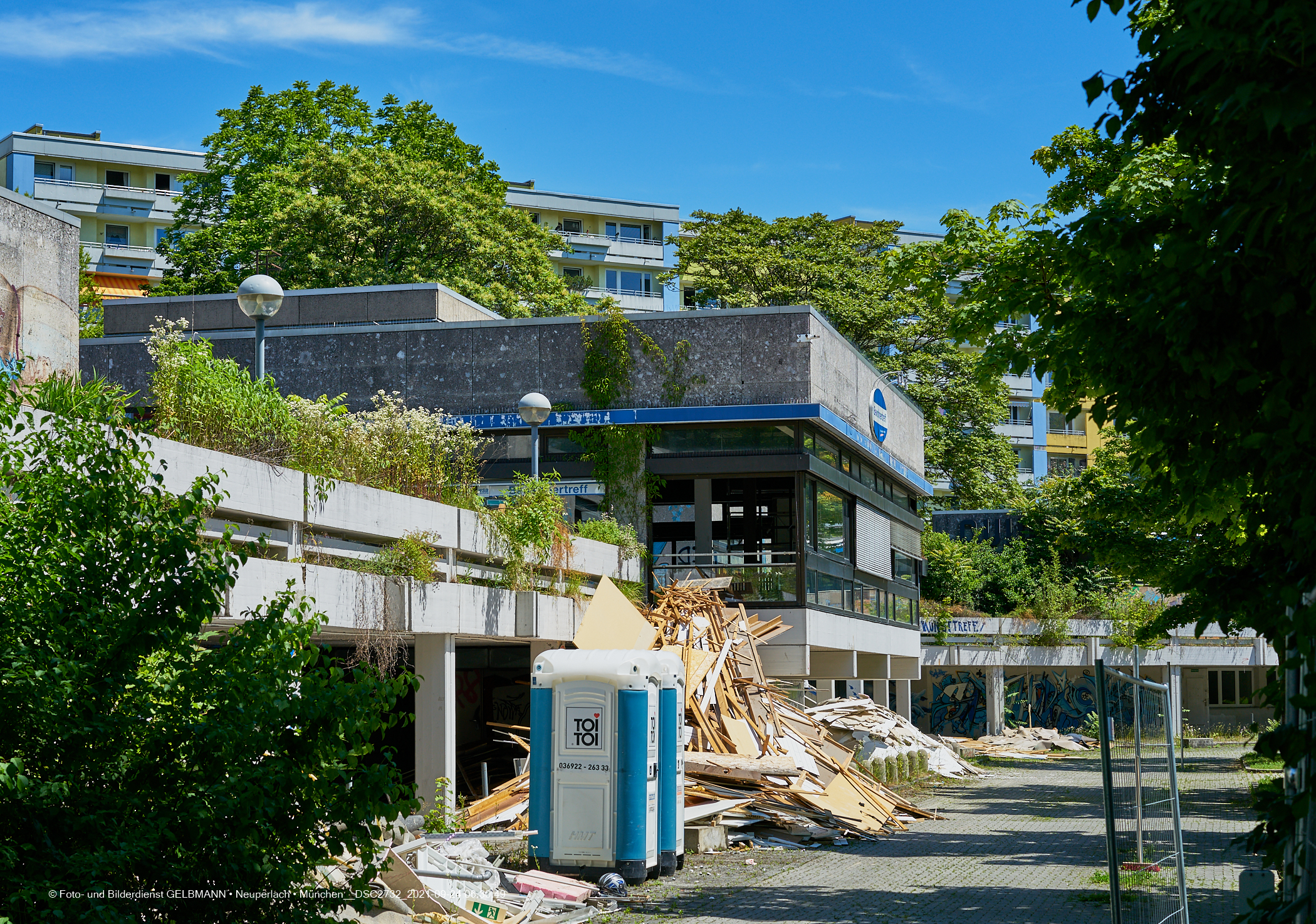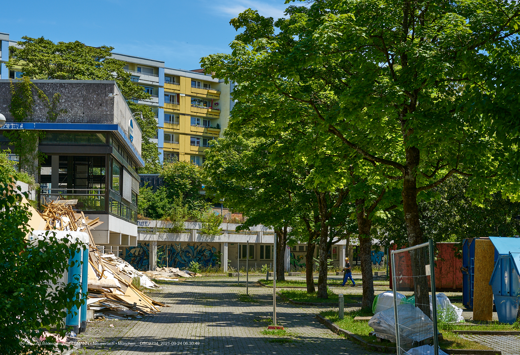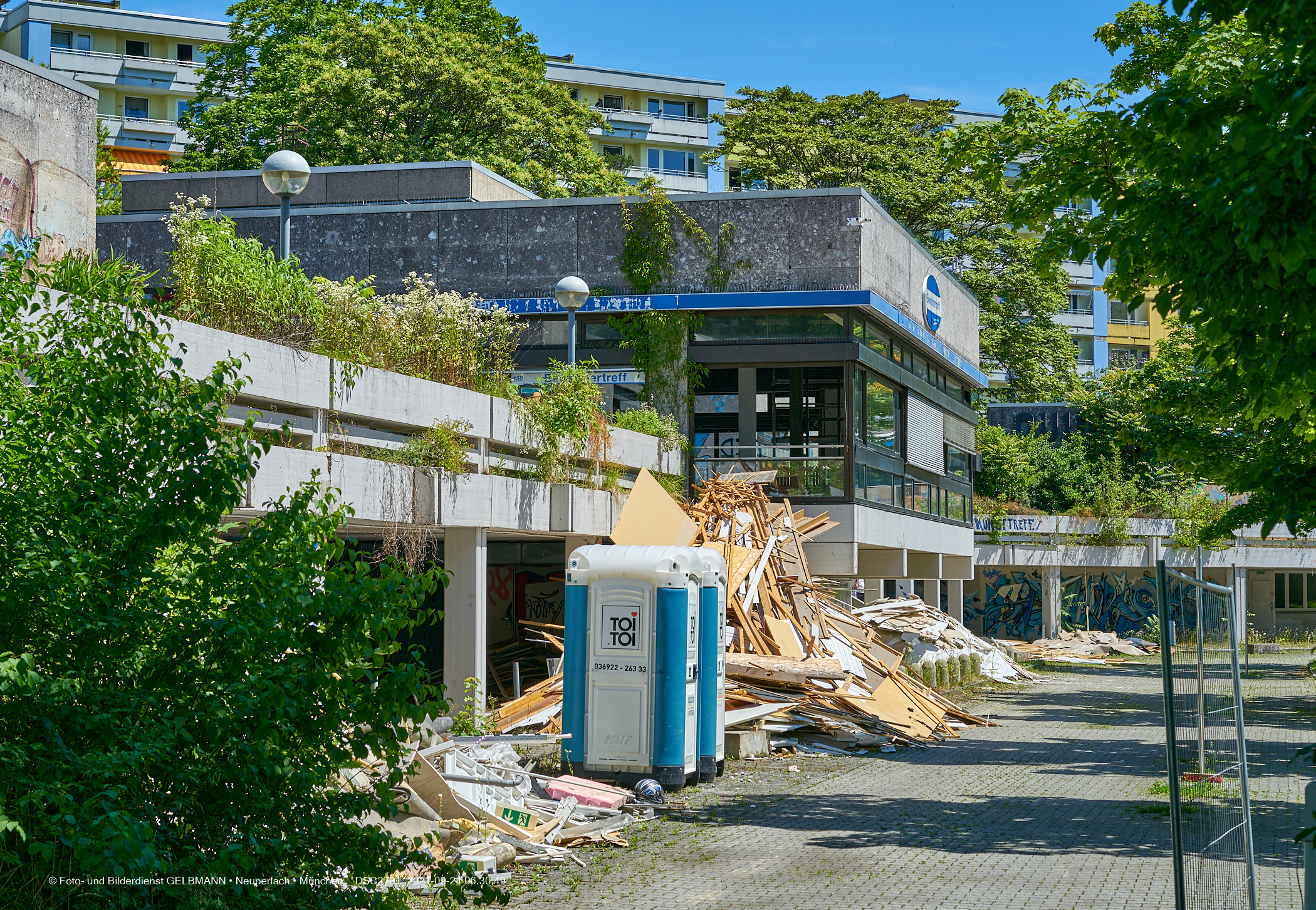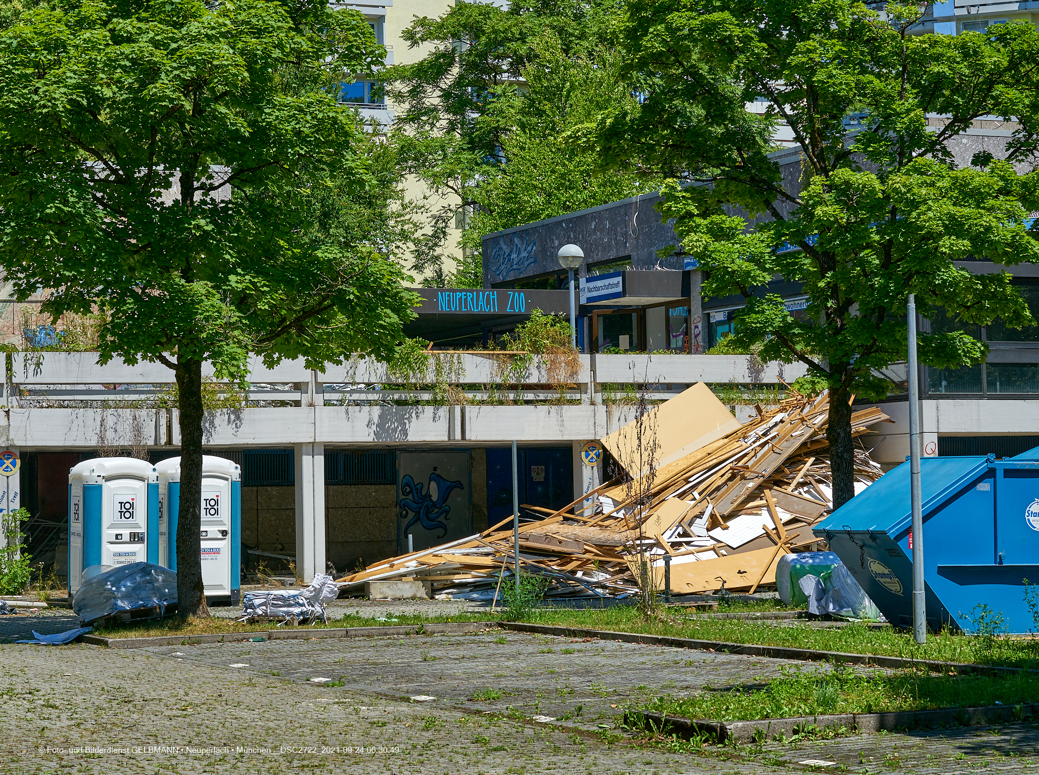 06.07.2021 - Der Abriss Quidde-Zentrum hat begonnen. Zuerst werden von den Handwerkern, Entkernungsarbeiten im Inneren durchgeführt. Holz und andere Wandverkleidung wurden auf den Parkplatz geworfen und dort sortiert.
