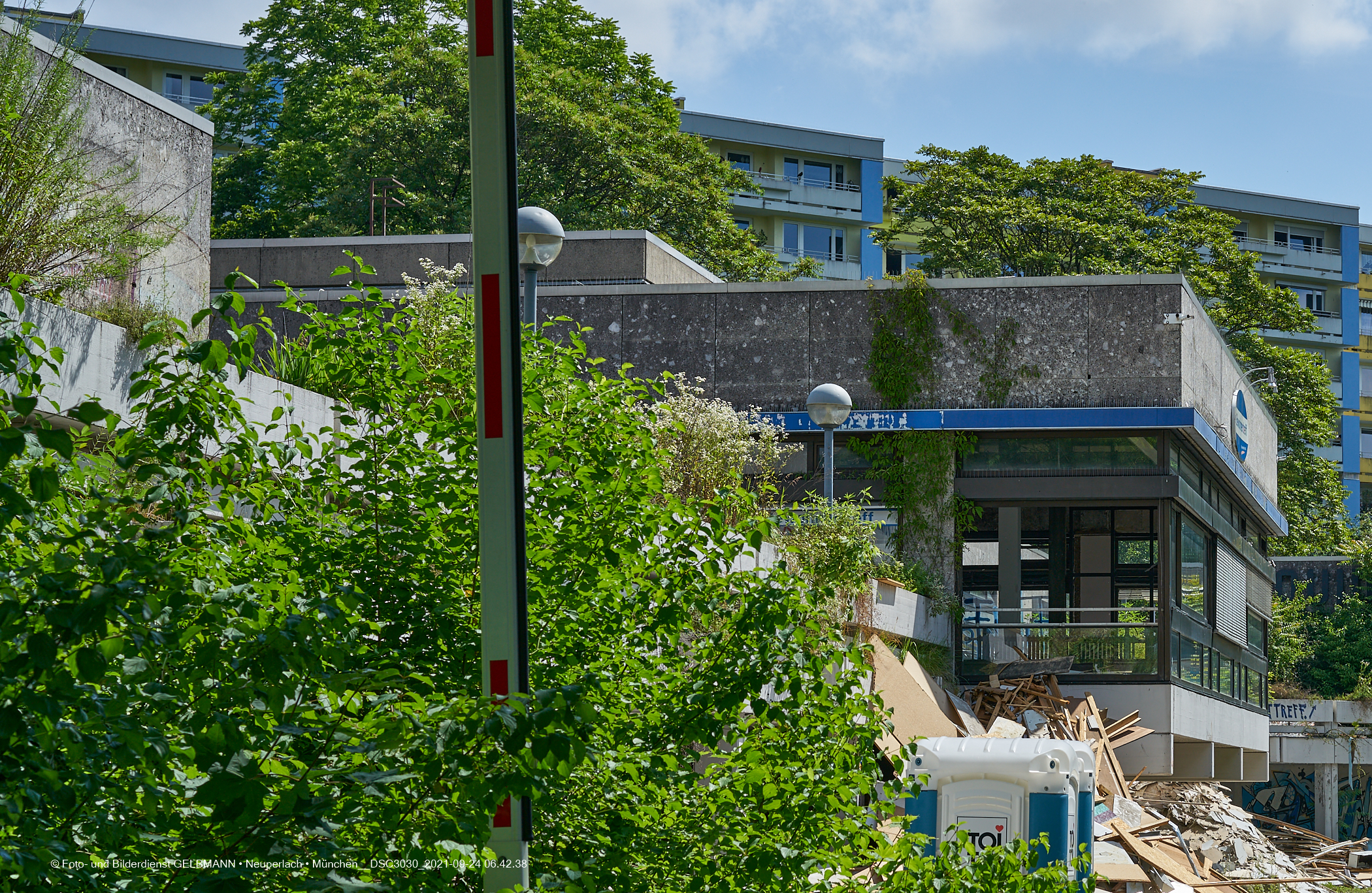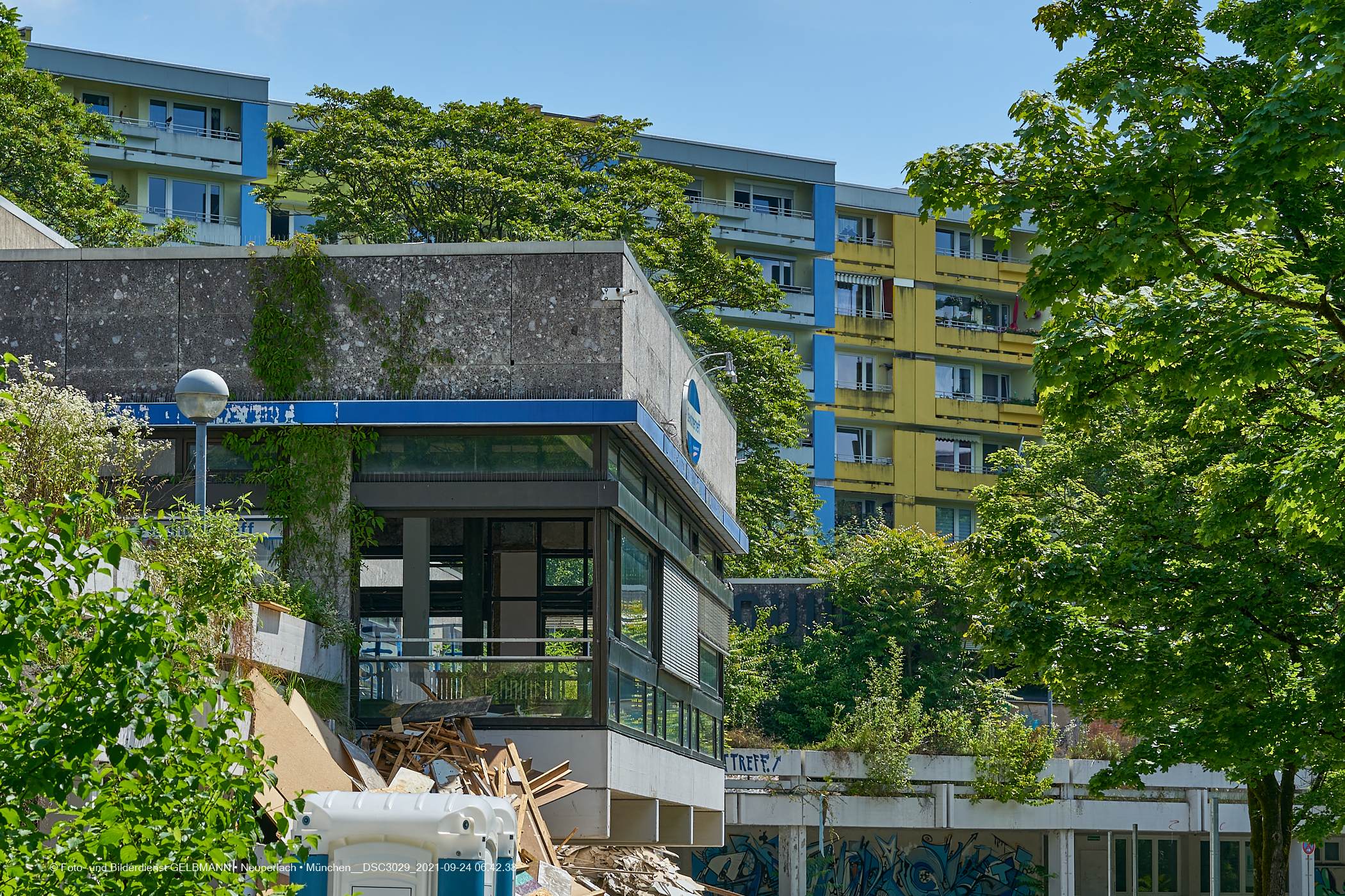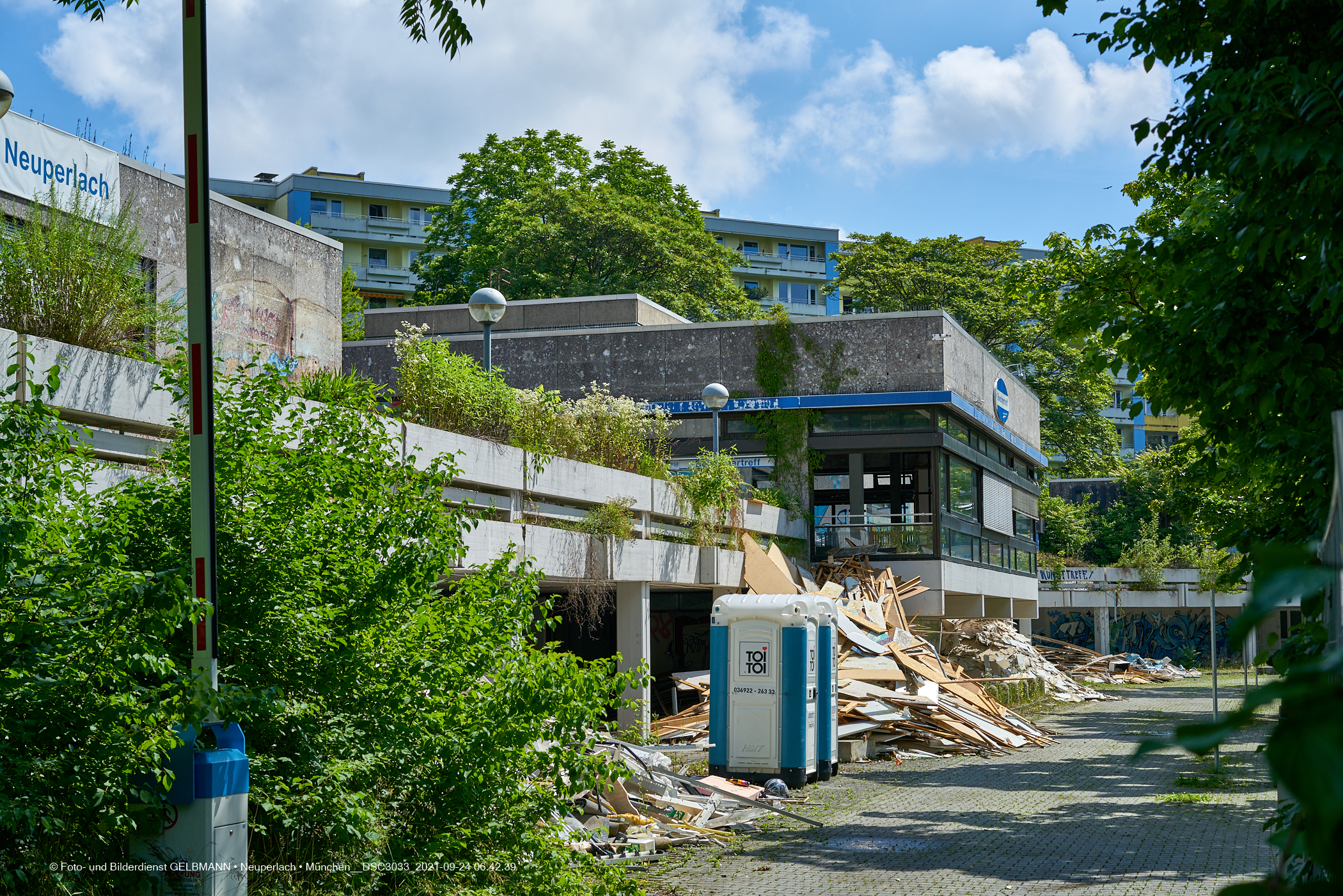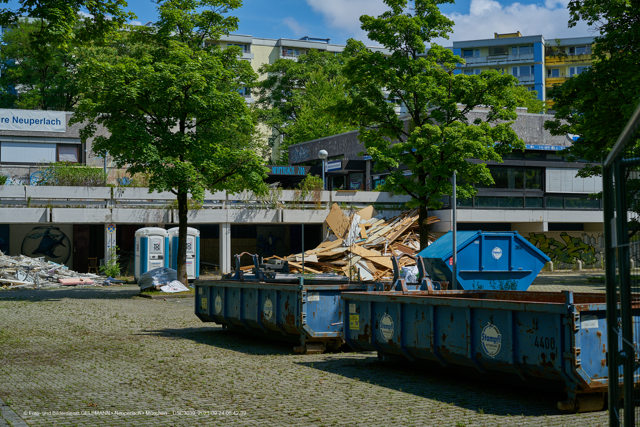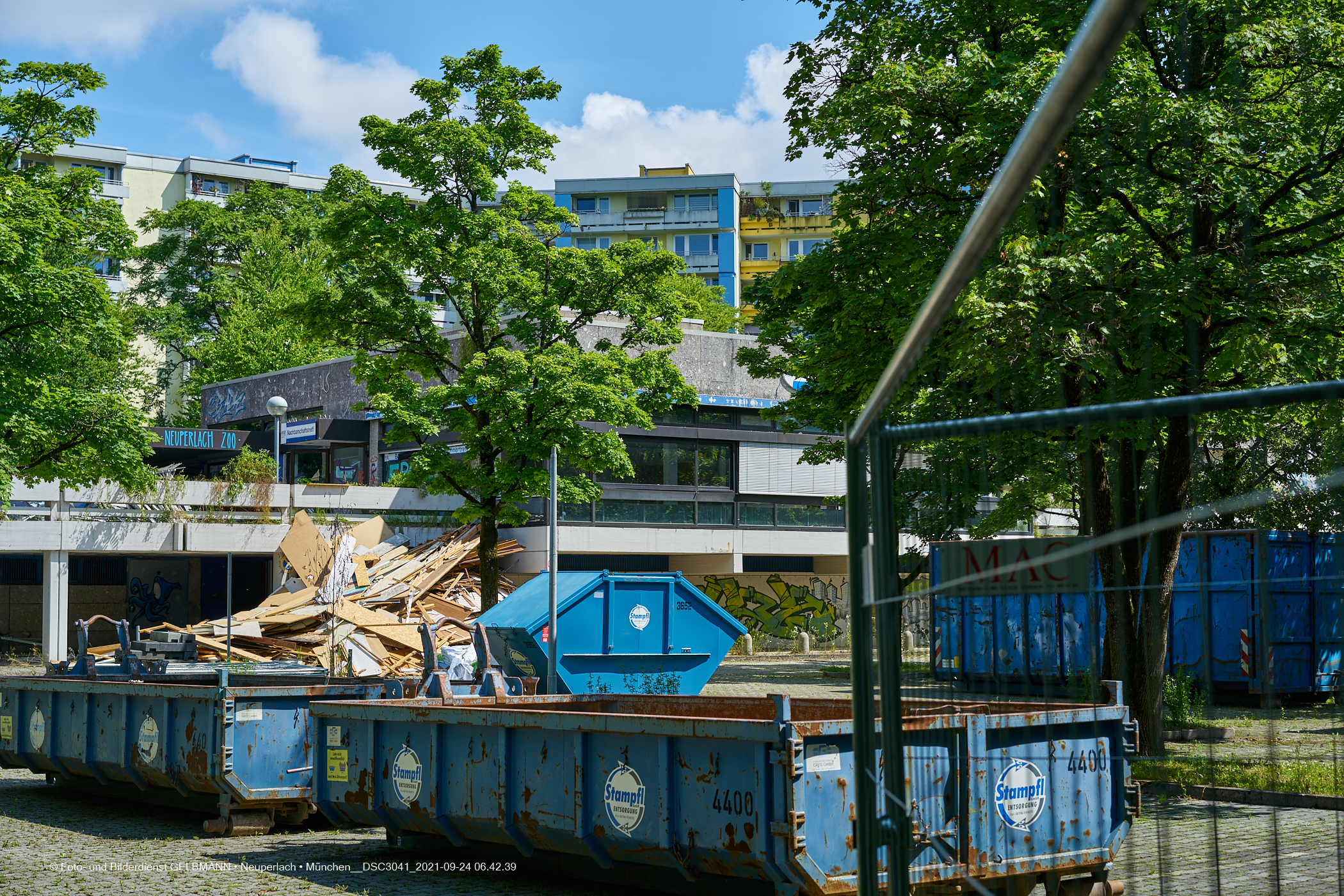 10.07.2021 - Der Abriss Quidde-Zentrum hat begonnen. Zuerst werden von den Handwerkern, Entkernungsarbeiten im Inneren durchgeführt. Holz und andere Wandverkleidung wurden auf den Parkplatz geworfen und dort sortiert.