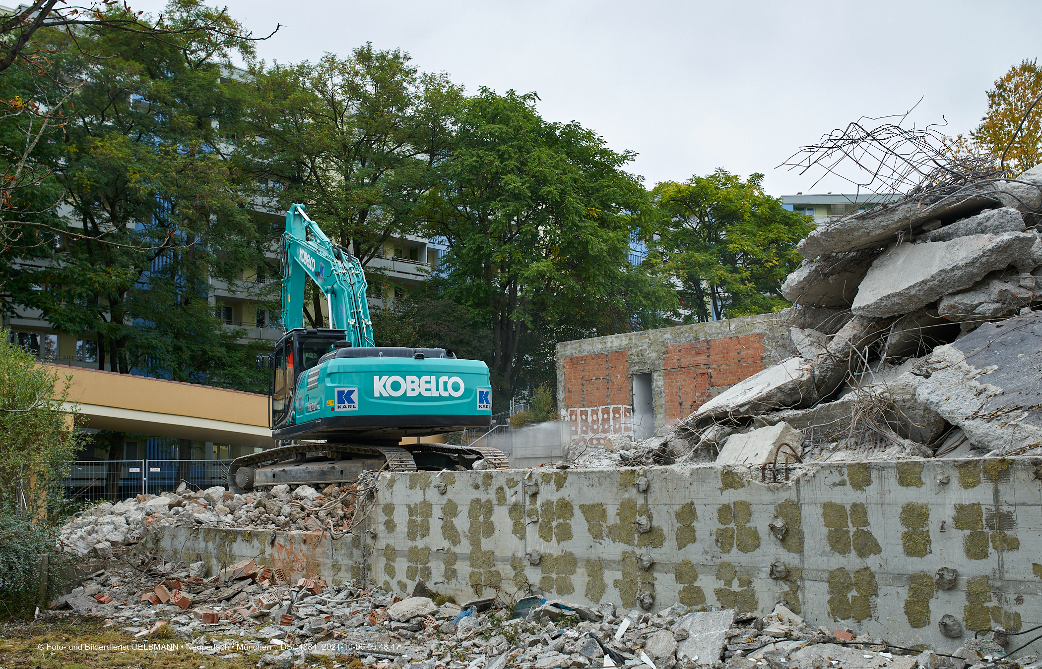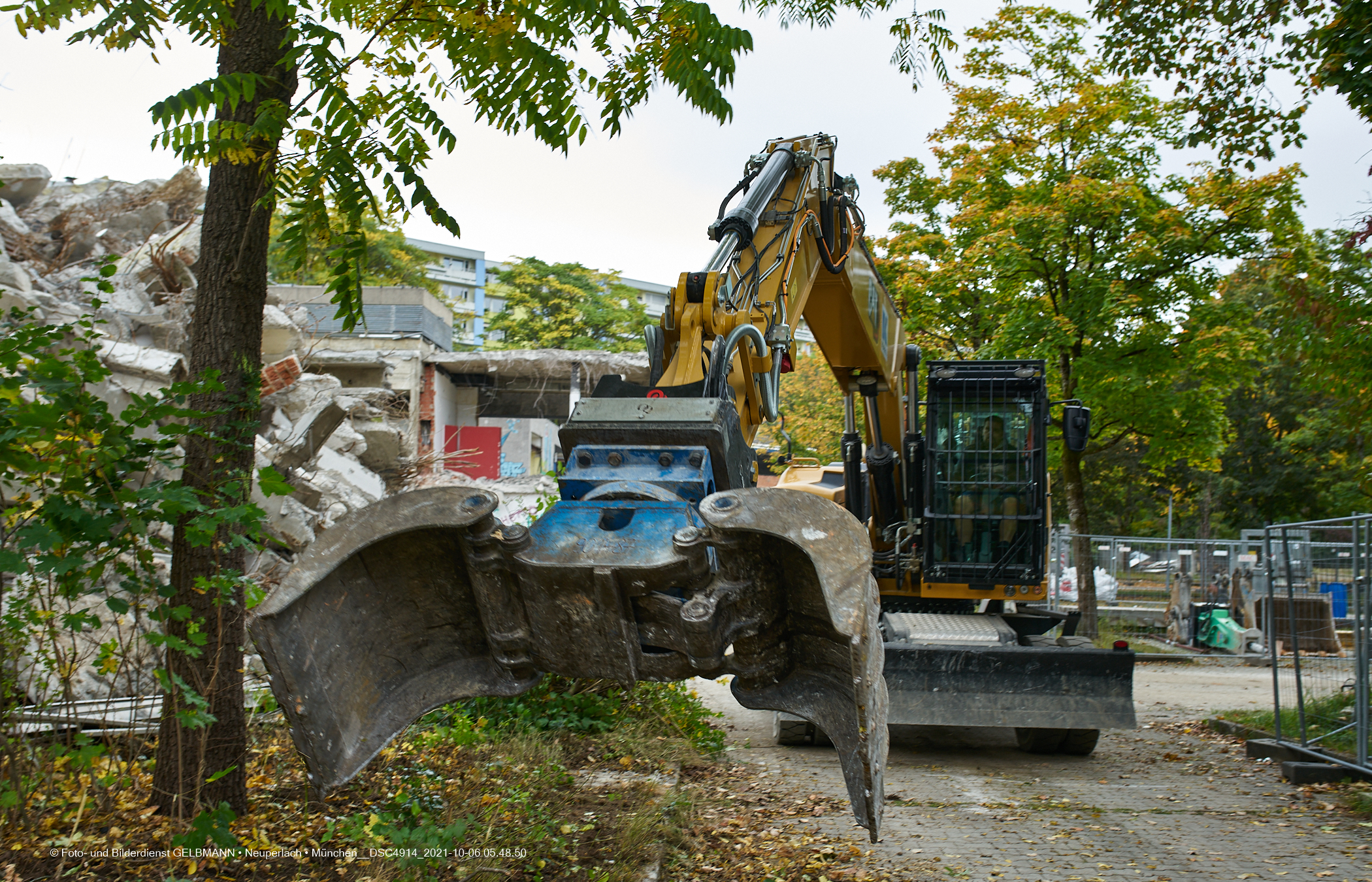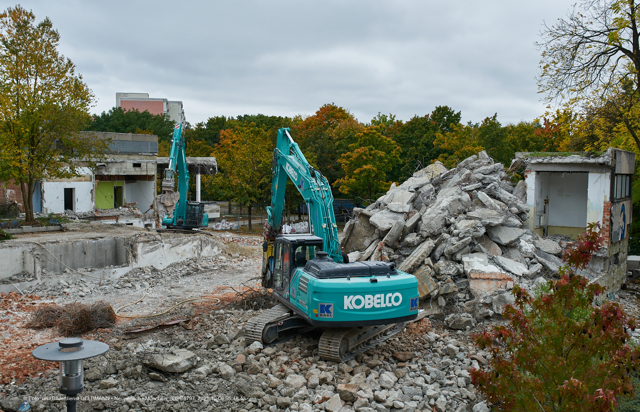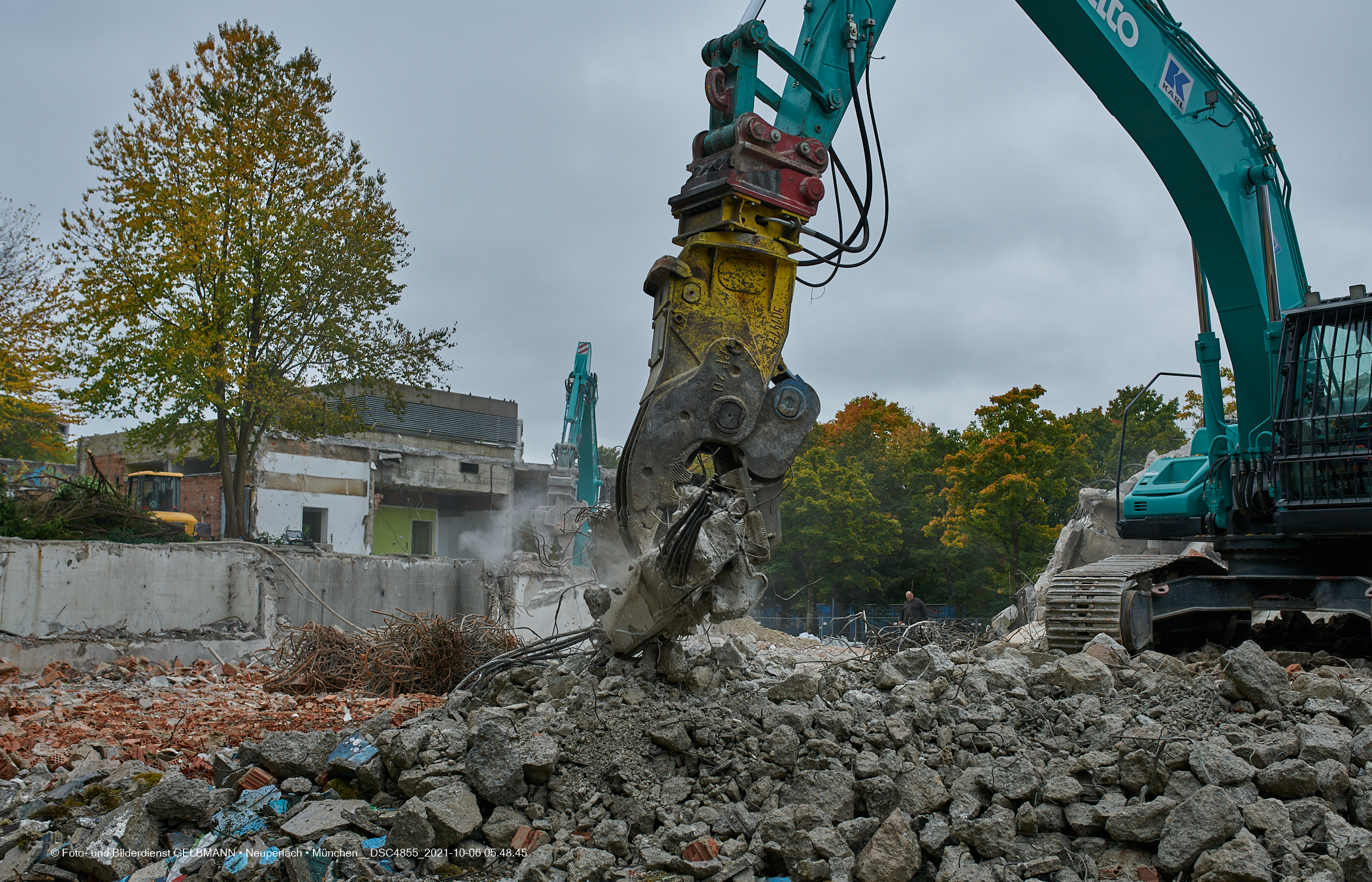 Inzwischen sind drei Bagger dabei, unser Quiddezentrum zu bearbeiten. Ein Bagger zerkleiner die Betonbrocken so, dass sie später in einer Presse zu noch kleineren Brocken gepresst werden können. Die anderen beiden Bagger sind weiter mit dem Abriss beschäftigt.