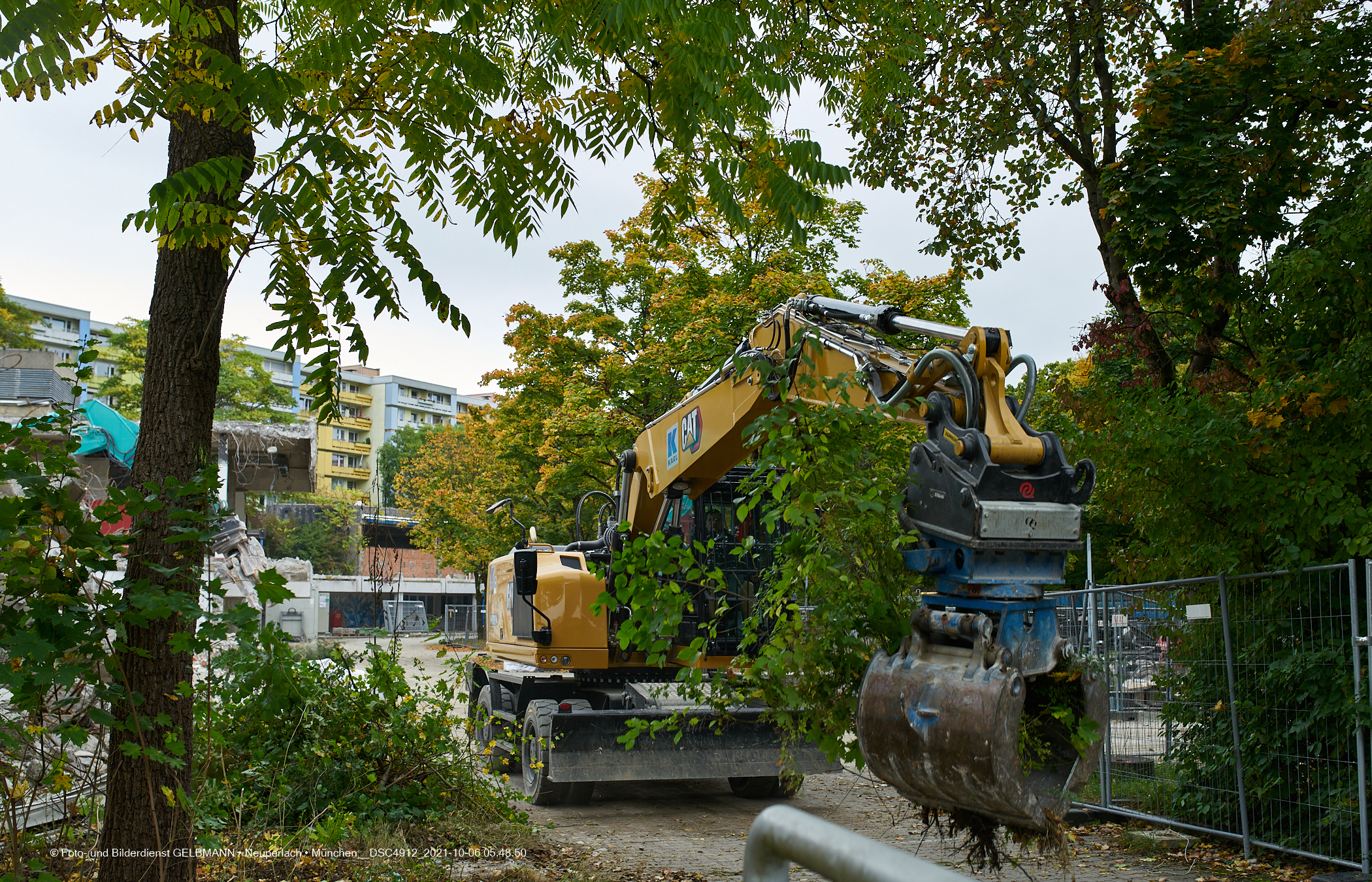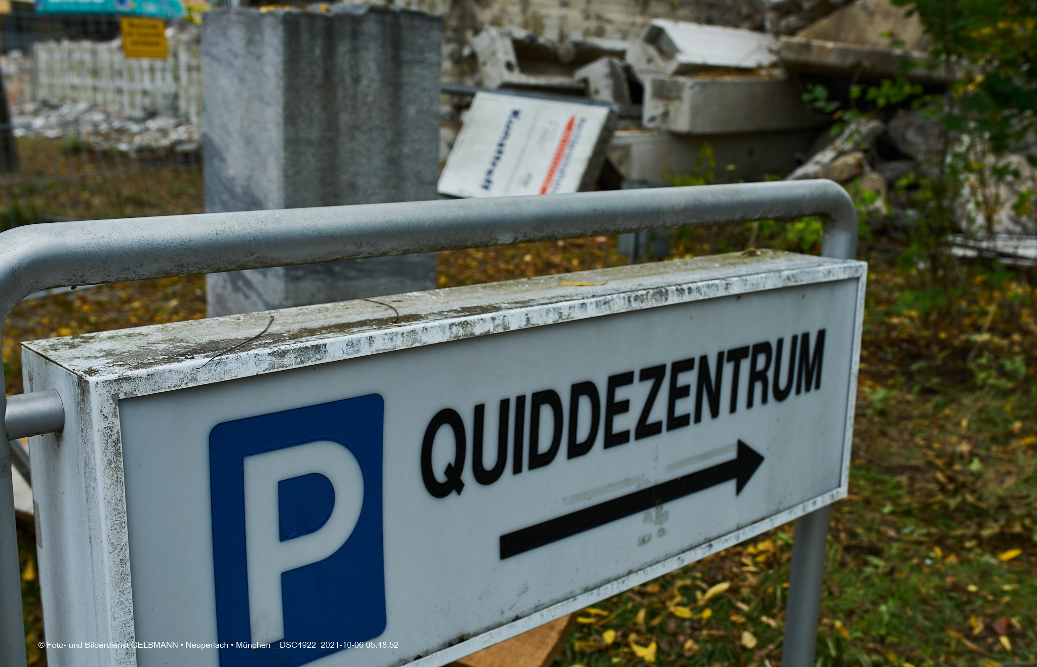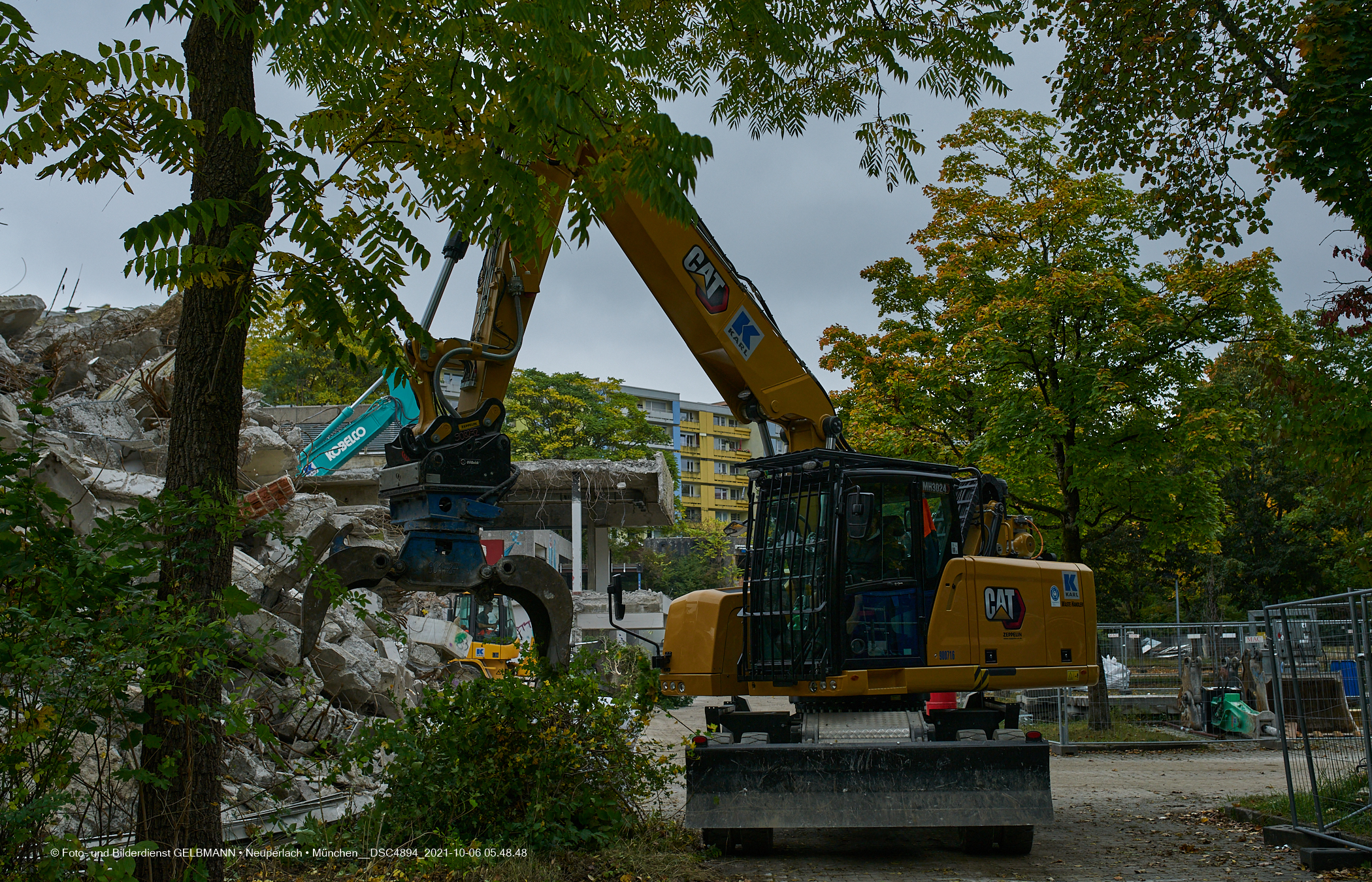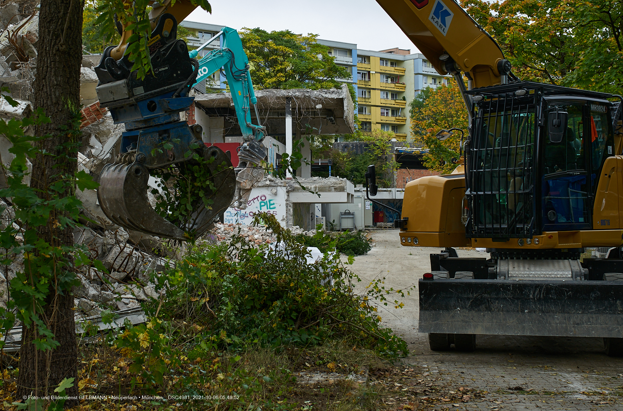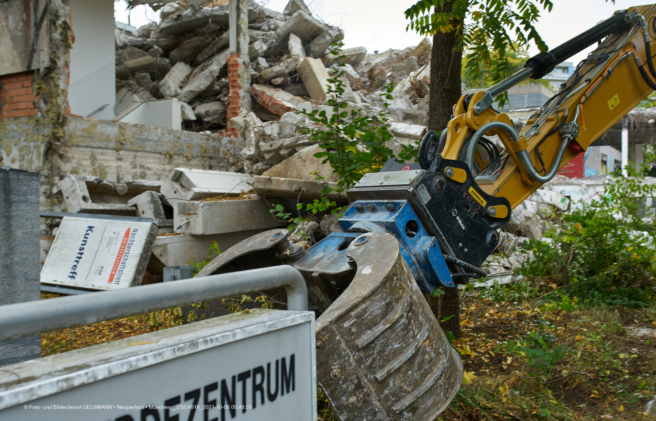 Inzwischen sind drei Bagger dabei, unser Quiddezentrum zu bearbeiten. Ein Bagger zerkleiner die Betonbrocken so, dass sie später in einer Presse zu noch kleineren Brocken gepresst werden können. Die anderen beiden Bagger sind weiter mit dem Abriss beschäftigt.