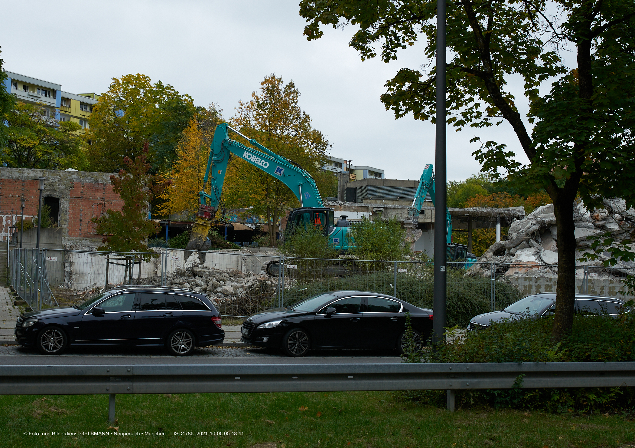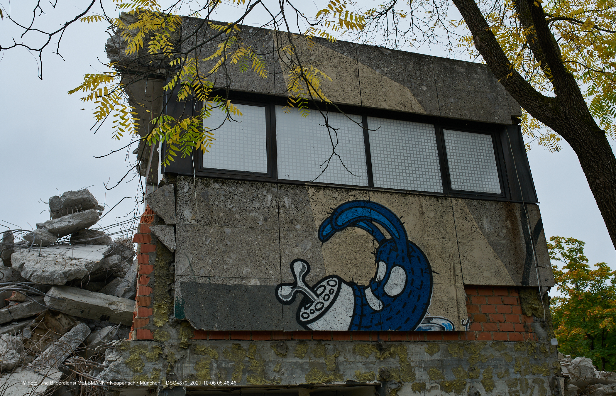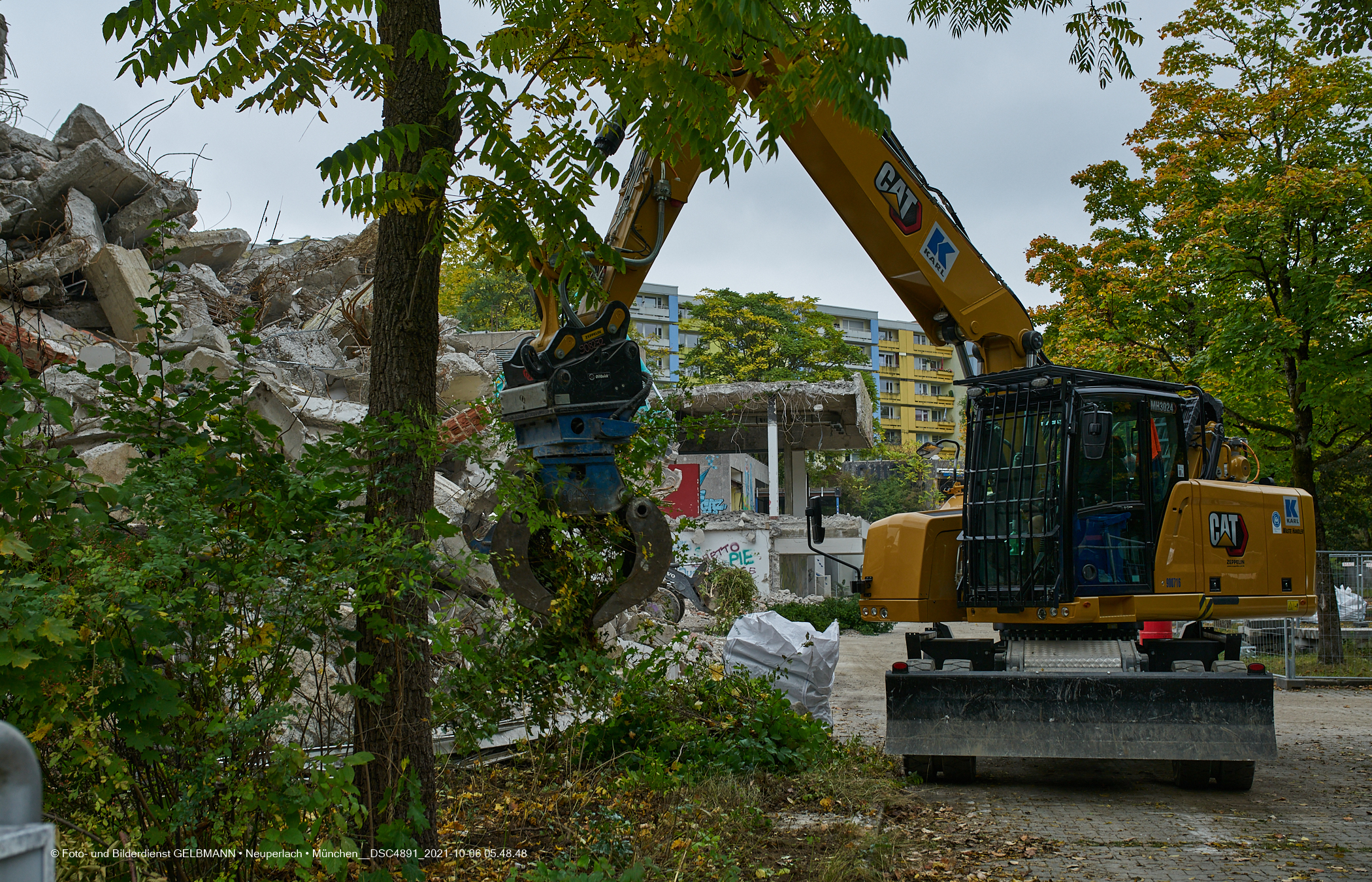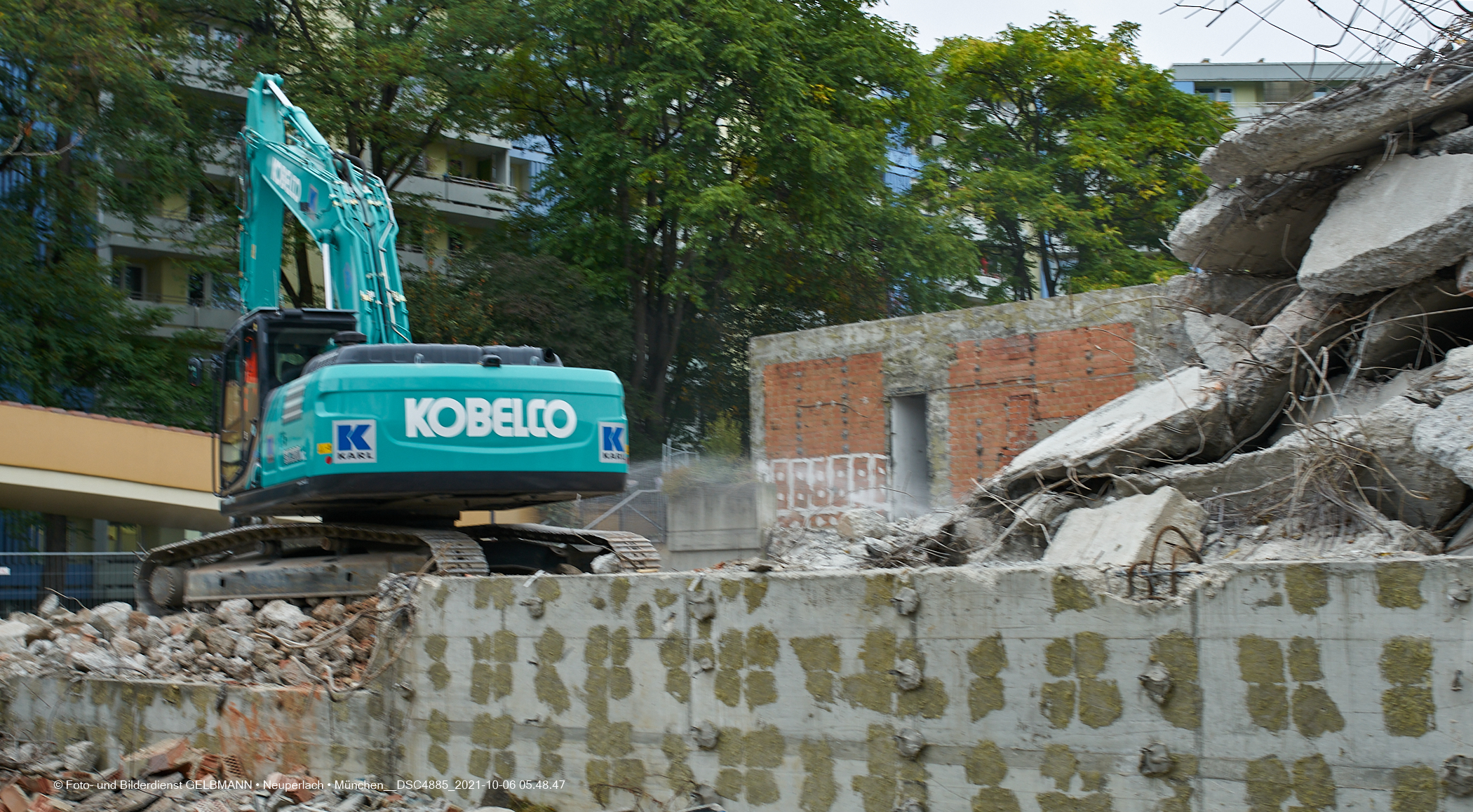 Inzwischen sind drei Bagger dabei, unser Quiddezentrum zu bearbeiten. Ein Bagger zerkleiner die Betonbrocken so, dass sie später in einer Presse zu noch kleineren Brocken gepresst werden können. Die anderen beiden Bagger sind weiter mit dem Abriss beschäftigt.